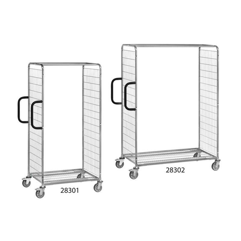 En kit selon le principe des «inserts» fetra construction en profilé et tube d´acier entièrement galvanisée. Ridelles en tube avec habillage en treillis métallique avec mailles de 100 x 50 mm, renforcée par 2 barres transversales. Plateau et châssis avec armature en profilé et habillage en treillis avec maille de 123 x 30 mm 2 poignées verticales boulonnées de chaque côté de la ridelle. 4 roues pivotantes à bandage TPE sur jantes en plastiques, moyeu à roulement à billes. Freins sur 2 roues conformément à la Norme 1757-3 (Sécurité des chariots de manutention). 4 protections antichocs en TPU (Polyuréthane thermoplastique) au-dessus des roues pivotantes.