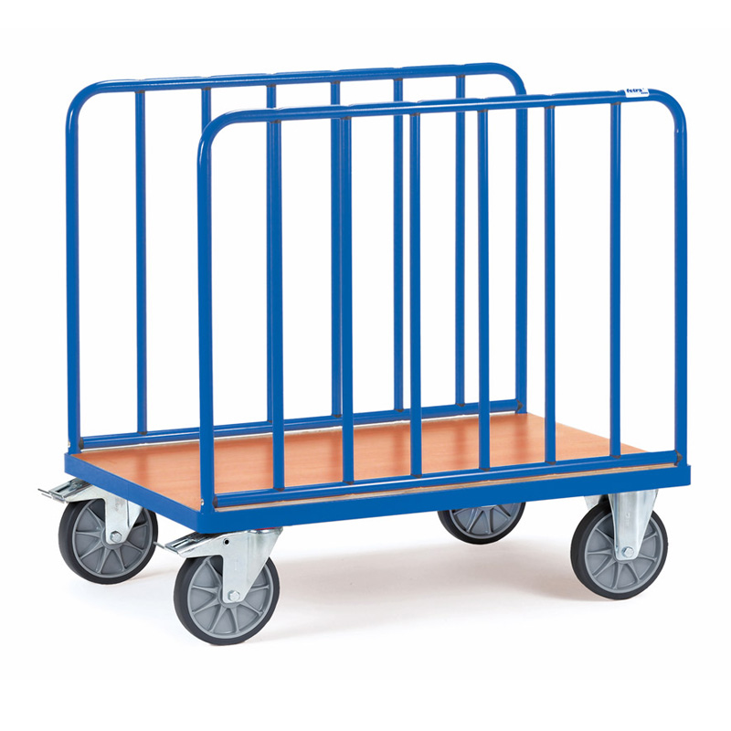 Ensemble mécano-soudé, revêtement époxy bleu RAL 5007, plateau en mélaminé surface effet hêtre, ridelles latérales avec barres verticales distantes de 130 mm, hauteur des ridelles 750 mm. 2 roues pivotantes et 2 roues fixes à bandage TPE, moyeu à roulement à billes central. Freins sur roues pivotantes conformément à la Norme 1757-3 (Sécurité des chariots de manutention).