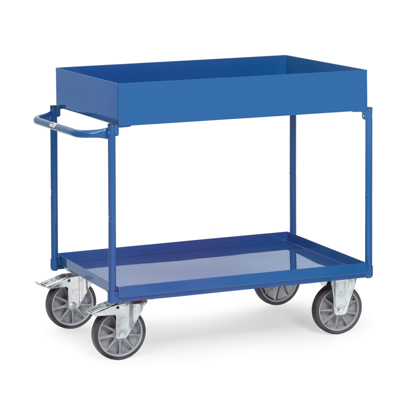 Construction en acier avec 2 plateaux étanches et rebord haut de 150 mm, revêtement époxy bleu RAL 5007, dossier de poussée horizontal. Charge maximum plateau du haut : 200 kg. 2 roues pivotantes et 2 fixes à bandage TPE, moyeu à roulement à billes central. Freins sur roues pivotantes conformément à la Norme EN 1757-3 (Sécurité des chariots de manutention).