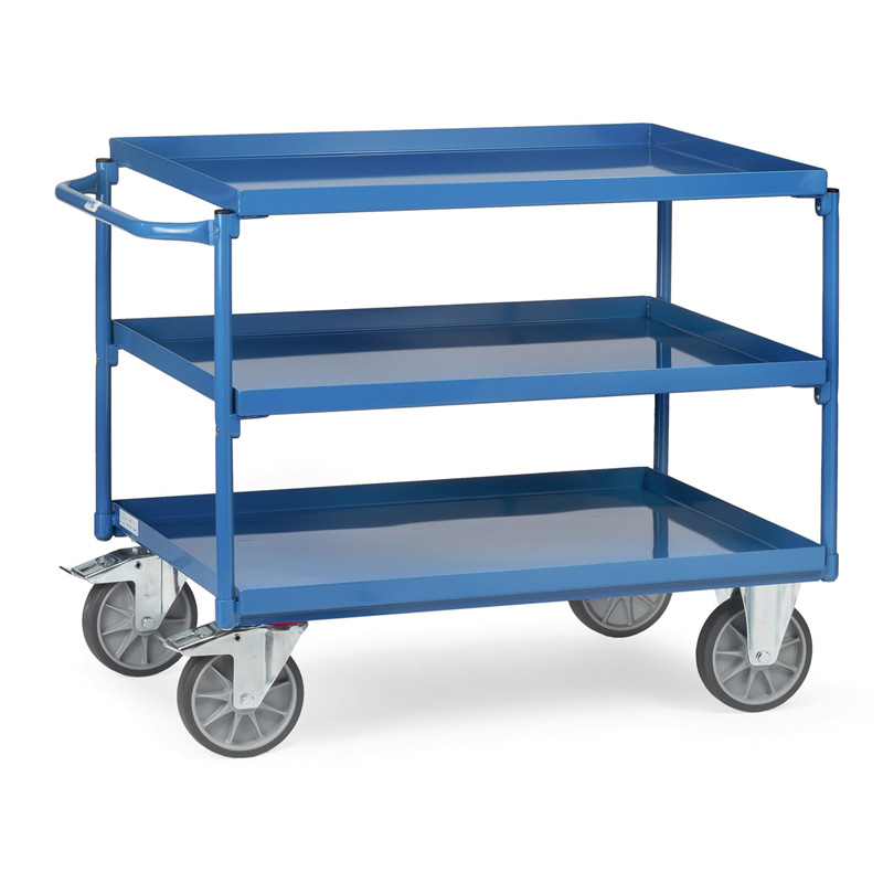 Construction en acier avec 3 plateaux étanches et rebord de 40 mm, revêtement époxy bleu RAL 5007, dossier de poussée horizontal. Charge maximum plateau du haut et médian : 200 kg. 2 roues pivotantes et 2 roues fixes à bandage TPE, moyeu à roulement à billes central. Freins sur roues pivotantes conformément à la Norme 1757-3 (Sécurité des chariots de manutention).
