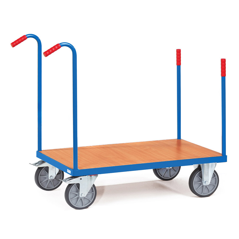 Système modulable. Ensemble mécano-soudé, revêtement époxy bleu RAL 5007, plateau en mélaminé surface effet hêtre. Longueur des barre 640 mm. 2 roues pivotantes et 2 roues fixes à bandage TPE, moyeu à roulement à billes central. Freins sur roues pivotantes conformément à la Norme 1757-3 (Sécurité des chariots de manutention).