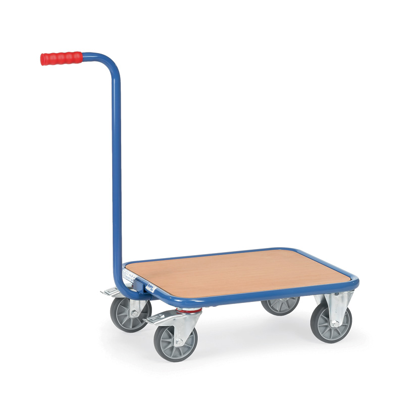 Chariot à col de cygne en tube d’acier, revêtement époxy bleu RAL 5007 avec plateau bois, poignée à boulonner, 2 roues pivotantes avec freins et 2 roues fixes à bandage TPE 125 x 32 mm, moyeu à roulement à billes central.