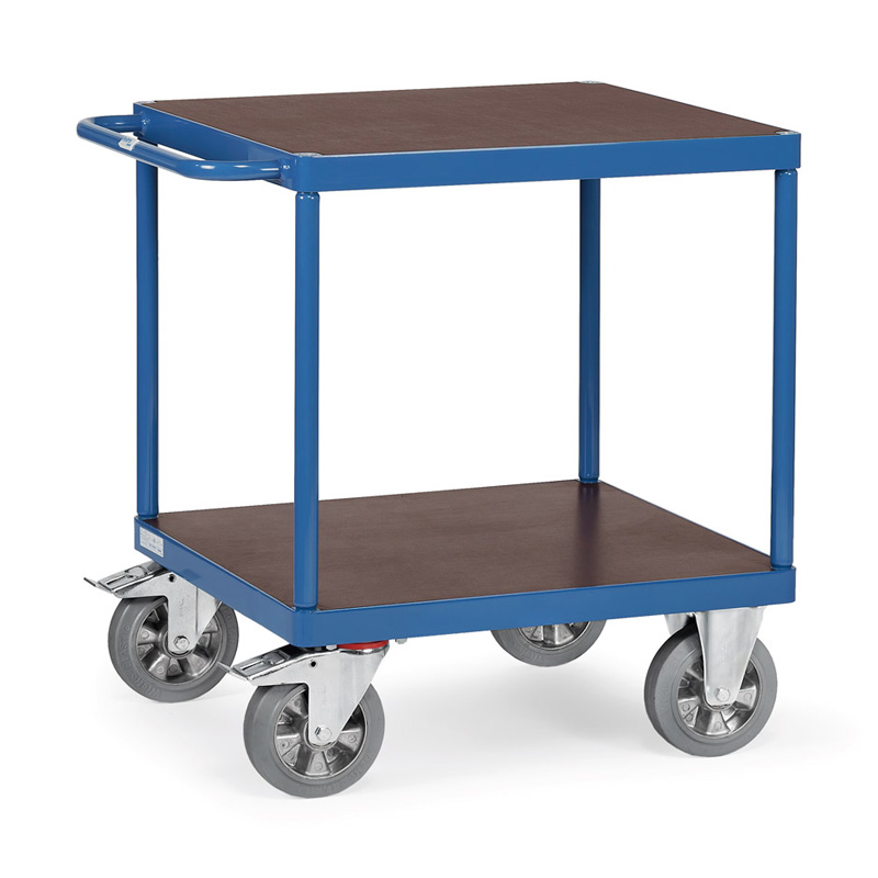 Ensemble mécano-soudé, revêtement époxy bleu RAL 5007. Plateaux en aggloméré antidérapant, plastifié et hydrofuge. Chariots spécialement conçus pour transporter des charges lourdes, les roues à bandage élastique sur jantes en aluminium avec moyeu à roulement à billes permettent un déplacement aisé et confortable. 2 roues fixes et 2 roues pivotantes à bandage caoutchouc élastique, bleu-gris non traçant, moyeu à roulement à billes. Freins sur roues pivotantes conformément à la Norme 1757-3 (Sécurité des chariots de manutention).