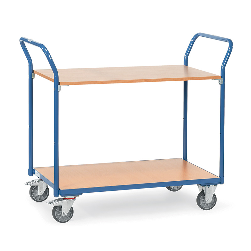 Ensemble mécano-soudé en tube d’acier, revêtement époxy bleu RAL 5007. Plate-forme en mélaminé surface effet hêtre. Plateau du haut amovible. 2 roues pivotantes et 2 roues fixes à bandage TPE, moyeu à roulement à billes central. Freins sur roues pivotantes conformément à la Norme EN 1757-3. Charge plateau du haut 80 kg.
