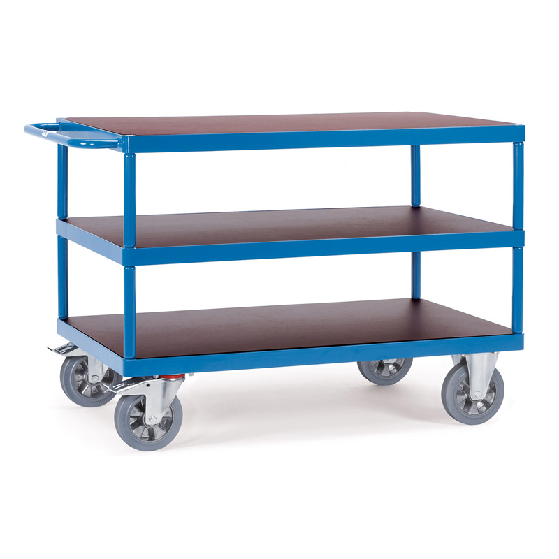 Ensemble mécano-soudé, revêtement époxy bleu RAL 5007. Plateaux en aggloméré antidérapant, plastifié et hydrofuge. Chariots spécialement conçus pour transporter des charges lourdes, les roues à bandage élastique sur jantes en aluminium avec moyeu à roulement à billes permettent un déplacement aisé et confortable. 2 roues fixes et 2 roues pivotantes à bandage caoutchouc élastique, bleu-gris non traçant, moyeu à roulement à billes. Freins sur roues pivotantes conformément à la Norme 1757-3 (Sécurité des chariots de manutention).