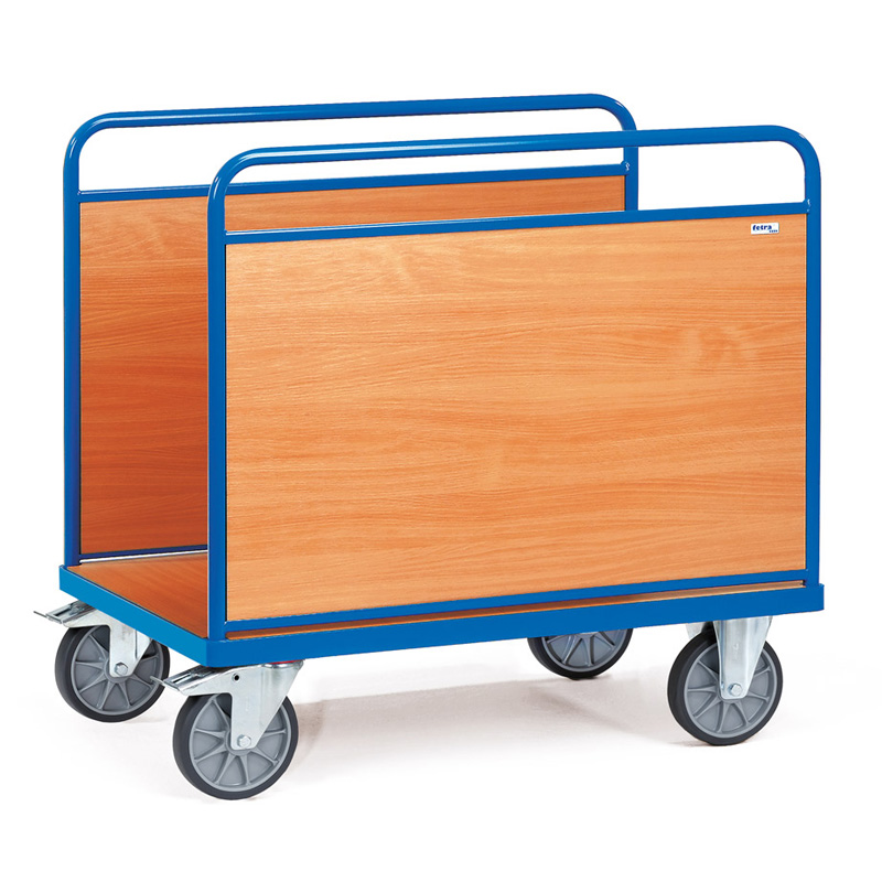 Ensemble mécano-soudé, revêtement époxy bleu RAL 5007 avec ridelles latérales en bois, largeur utile 60 mm, hauteur 600/750. 2 roues pivotantes et 2 roues fixes à bandage TPE, moyeu à roulement à billes central. Freins sur roues pivotantes conformément à la Norme 1757-3 (Sécurité des chariots de manutention).