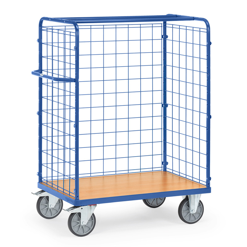 Ensemble mécano-soudé, revêtement époxy bleu RAL 5007. 1 plateau fixe en mélaminé surface effet hêtre. 3 côtés grillagés mailles de 100 x 100 x 5 mm. 2 roues pivotantes et 2 roues fixes à bandage TPE, moyeu à roulement à billes central. Freins sur roues pivotantes conformément à la Norme EN 1757-3.