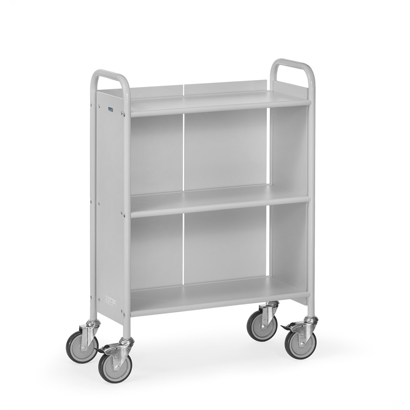 Ensemble mécano-soudé, revêtement époxy gris clair RAL 7035. 3 plateaux fixes et une cloison arrière. Longueur totale : 810 mm. Largeur totale : 385 mm. 4 roues pivotantes à bandage TPE élastique non tachant, moyeu à palier lisse. 2 roues avec freins conformément à la Norme 1757-3. Charge maximum par étagère : 50 kg.