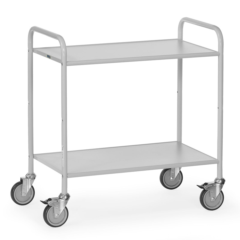 Ensemble mécano-soudé, revêtement époxy gris clair RAL 7035. 2 plateaux fixes. Longueur totale : 900 mm, largeur totale : 535 mm. 4 roues pivotantes à bandage TPE élastique non tachant, moyeu à palier lisse. 2 roues avec freins conformément à la Norme 1757-3. Charge maximum par étagère : 50 kg.