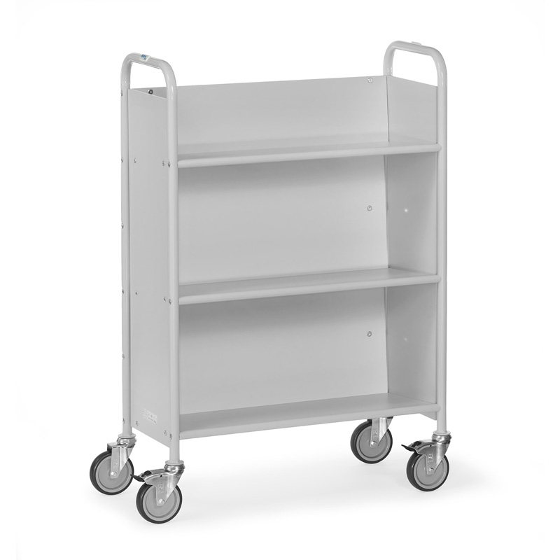 Ensemble mécano-soudé, revêtement époxy gris clair RAL 7035. 3 plateaux avec cloisons inclinés de 27 mm par rapport à l’angle droit. Longueur totale : 855 mm, largeur totale : 400 mm. 4 roues pivotantes à bandage TPE élastique non tachant, moyeu à palier lisse. 2 roues avec freins conformément à la Norme 1757-3. Charge maximum par étagère : 50 kg.