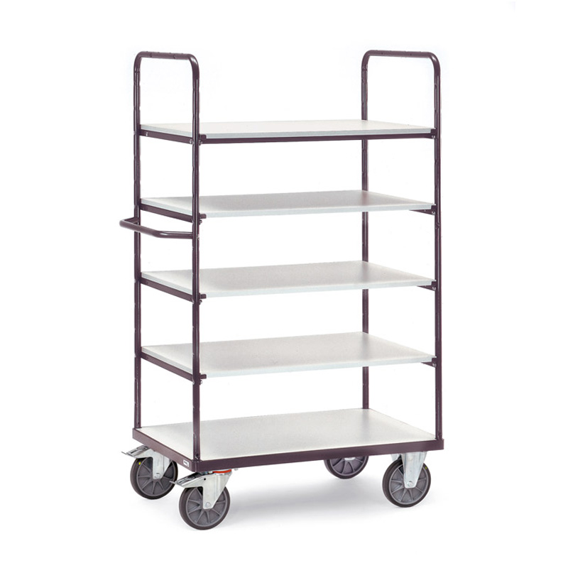 Tous les éléments sont conducteurs d’électricité. Ensemble mécano-soudé, revêtement époxy gris foncé. 5 plateaux gris clair conforme à la Norme DIN 68765. 2 roues pivotantes et 2 fixes à bandage TPE-ESD (Élastomère thermoplastique), conductrices d´électricité, moyeu à roulement à billes de précision. Déplacement confortable : Peu de résistance au démarrage, au déplacement et à la rotation. Déplacement peu bruyant sur sols plats, bandage non traçant. Freins sur roues pivotantes, conformément à la norme EN1757-3 (Sécurité des chariots de manutention). Charge maximum par étagère : 50 kg.