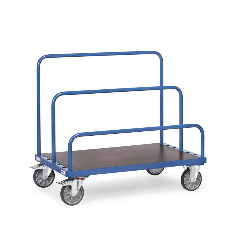 Ensemble mécano-soudé, revêtement époxy, plate-forme en bois. 7 positions pour insérer des ridelles tubulaires distantes de 90 mm. 2 roues fixes et 2 roues pivotantes à bandage TPE (750 kg) ou à bandage caoutchouc élastique, bleu gris non traçant (1200 kg), moyeu à roulement à billes. Freins sur roues pivotantes. Livré sans tubes cintrés.