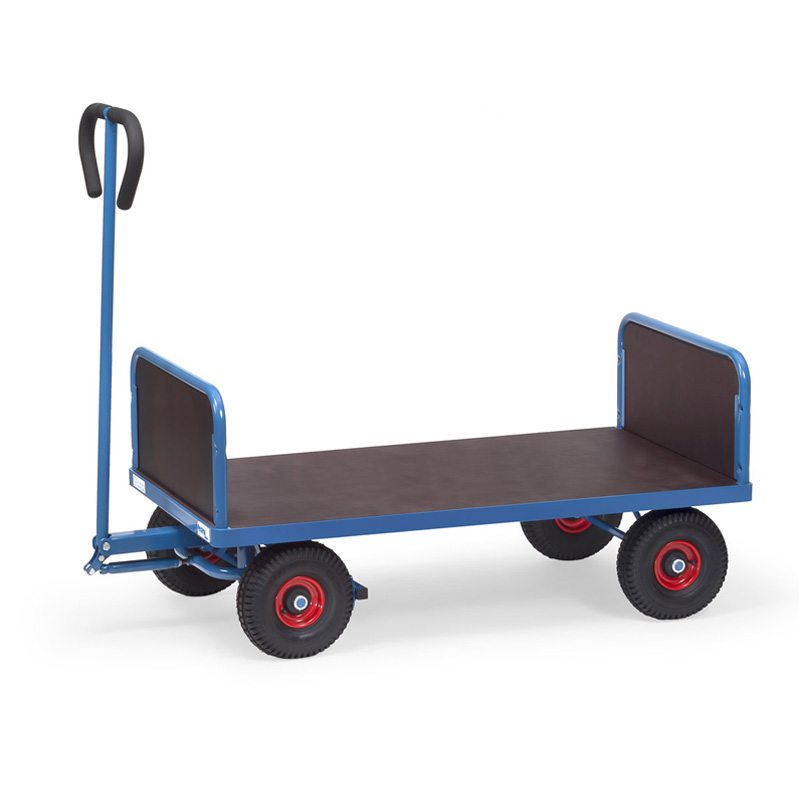En tube d´acier soudé, revêtement époxy bleu RAL 5007. Timon à boulonner, lateau en contreplaqué hydrofuge, avec 2 ridelles petit côté hauteur 300 mm, châssis en tube d´acier plateau en contreplaqué hydrofuge. Essieu avec timon et poignée. Au choix roues gonflables ou à bandage caoutchouc, moyeu à roulement à rouleaux. Poignée sécurisée avec revêtement souple remontant automatiquement en position verticale. Blocage automatique de l´essieu avant, conformément à la Norme EN 1757-3.