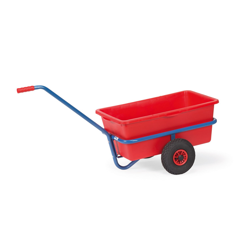 Char à bras léger en tube et profilé d´acier soudés, revêtement époxy bleu RAL 5007. Timon à boulonner. Avec cuvette rouge (Contenance de 90 à 200 litres) Au choix roues gonflables ou à bandage caoutchouc, moyeu à roulement à rouleaux. Livré non monté, montage facile.