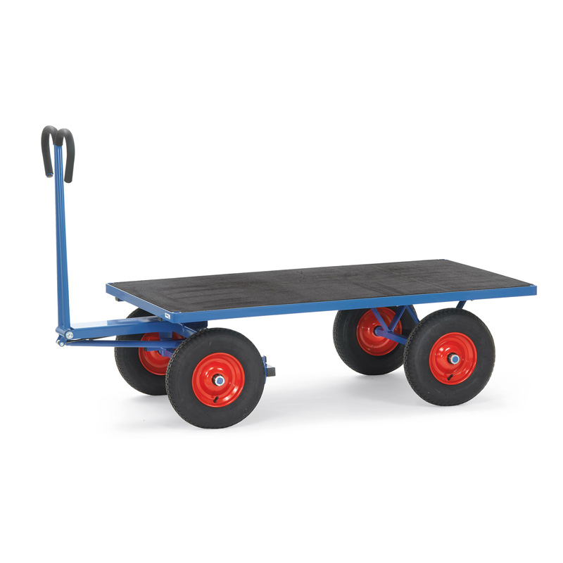 Ensemble mécano-soudé, revêtement époxy bleu RAL 5007. 4 inserts dans les angles, essieu sur rond à billes, timon en triangle avec poignée et revêtement en plastique sécurisée remontant automatiquement en position verticale. Plateau en contreplaqué avec revêtement antidérapant et hydrofuge. Roues à bandage caoutchouc ou gonflables, moyeu à roulement à rouleaux. Freinage automatique sur essieu avant conformément à la Norme 1757-3.
