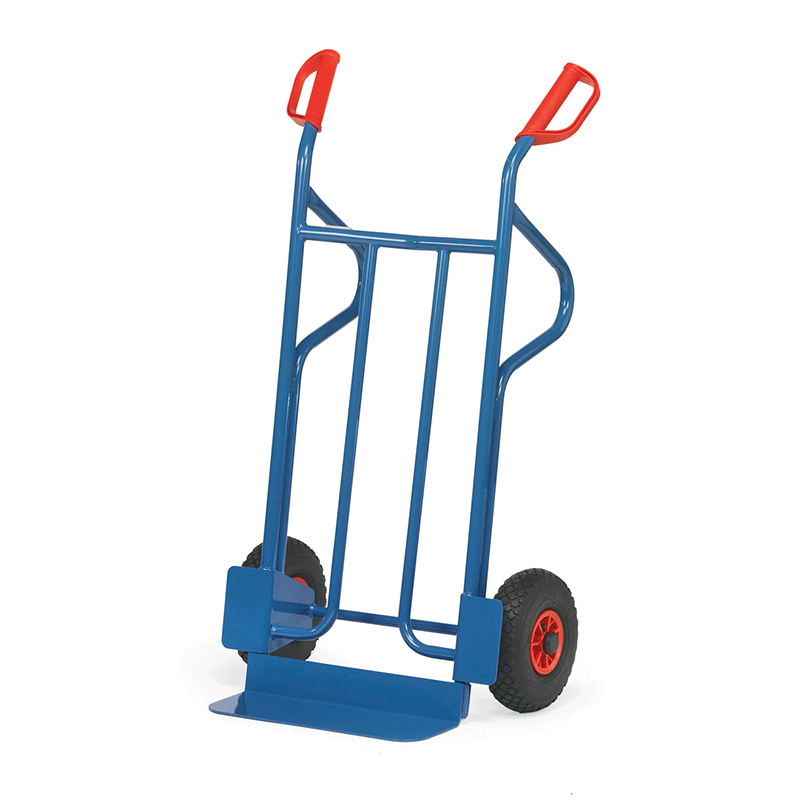 Ensemble mécano-soudé en tube et tôle d’acier, revêtement époxy bleu RAL 5007. Poignées de sécurité en plastique dur avec arceaux de sécurité. Bavette en tôle d’acier à boulonner et remplaçable. Roues à bandage caoutchouc ou gonflables, moyeu à roulement à rouleaux. Livré avec bavette démontée.