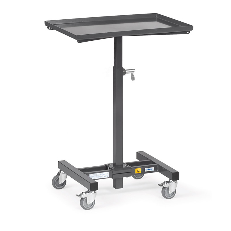 Construction en profilé et tube d?acier avec plateau en tôle avec rebord de 20 mm. Non inclinable, hauteur réglable au pas de 25 mm, à partir de 695 ? 970 mm. Revêtement époxy conducteur d?électricité gris ardoise RAL 7015. 4 roues pivotantes à bandage TPE-ESD, conductrices d?électricité, roulement à palier lisse. 2 roues avec freins conformément à la Norme 1757-3 (Sécurité des chariots de manutention).