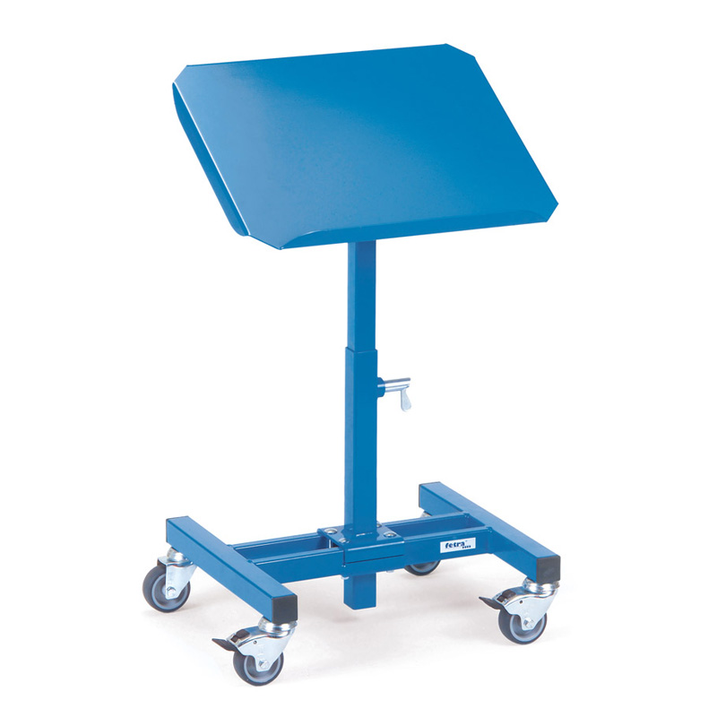 Construction en profilé et tube d’acier avec plateau en tôle d’acier et rebord de 20 mm sur un grand côté, revêtement époxy bleu RAL 5007. Pour bacs en plastiques, corbeilles en treillis etc.. Hauteur réglable au pas de 25 mm. Inclinable de 0°, 15° et 30°. 4 roues pivotantes à bandage TPE, moyeu à palier lisse. 2 roues avec freins.