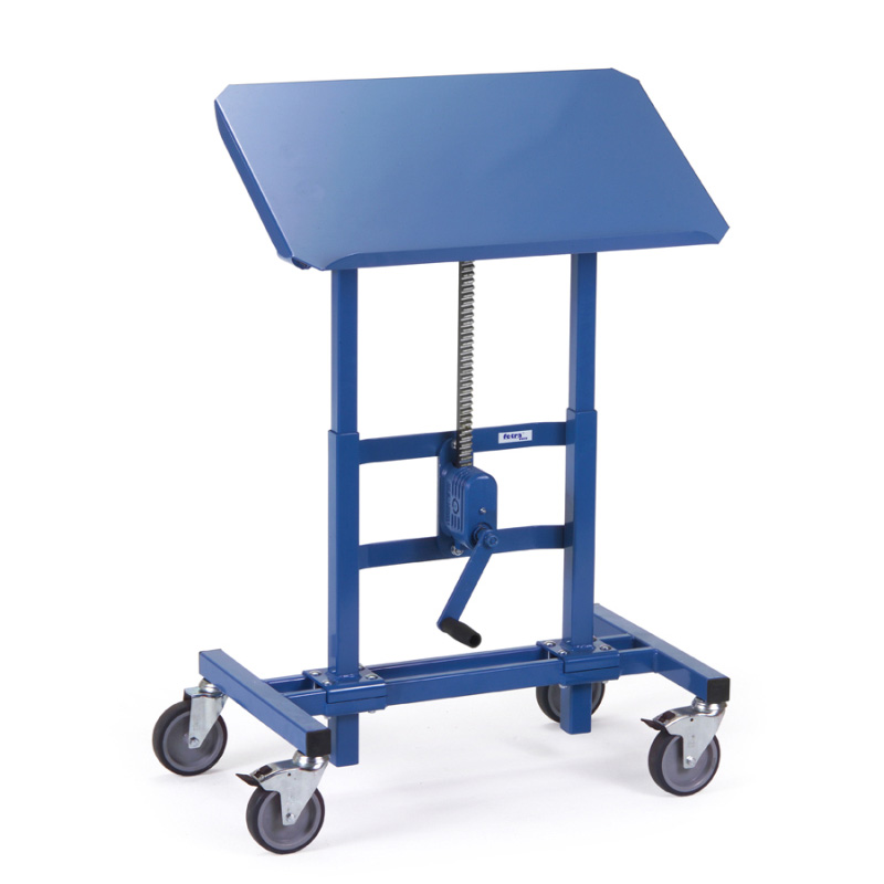 Construction en profilé et tube d’acier avec plateau en tôle d’acier et rebord de 20 mm sur un grand côté, revêtement époxy bleu RAL 5007. Pour bacs en plastiques, corbeilles en treillis etc.. Hauteur règlable (même chargé), par une cremaillère avec 2 guides téléscopiques. Inclinable de 0°, 15° et 30°. 4 roues pivotantes à bandage TPE, moyeu à palier lisse. 2 roues avec freins.