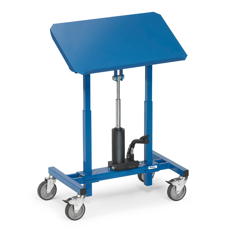 Construction en profilé et tube d’acier avec plateau en tôle d’acier et rebord de 20 mm sur un grand côté, revêtement époxy bleu RAL 5007. Pour bacs en plastiques, corbeilles en treillis etc.. Hauteur réglable (même chargé) par pompe hydraulique, montée par pédale, descente précise par molette. Inclinable de 0°, 15° et 30°. 4 roues pivotantes à bandage TPE, moyeu à palier lisse. 2 roues avec freins.