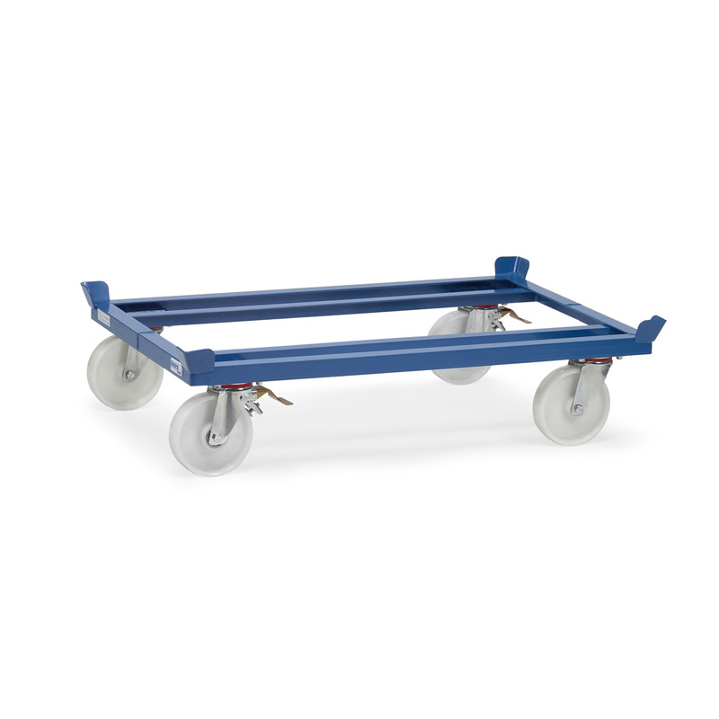 Construction robuste en profilé d´acier avec 4 coins de centrage, revêtement époxy, bleu RAL 5007, 2 roues pivotantes en polyamide, moyeu à roulement à billes de précision, 2 roues pivotantes à freins placées sous le châssis et diagonalement. Garde au sol : 235mm