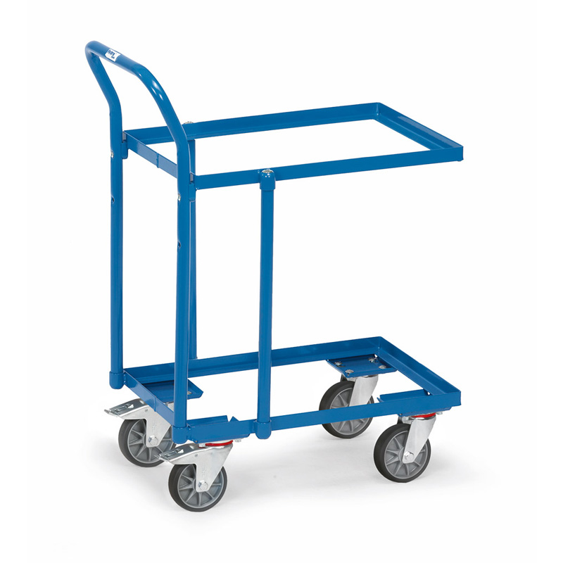 Construction en profilé d’acier, revêtement époxy bleu RAL 5007. Plateaux à armature ouverte et dossier de poussée pour le transport de bacs Norme Euro. 4 roues pivotantes à bandage TPE, moyeu à roulement à billes central. 2 roues avec freins conformément à la Norme EN 1757-3. Compatible pour bacs plastiques 600 x 400 mm. Réf. 135610 avec plateau en mélaminé surface effet hêtre et rebord de 10 mm.