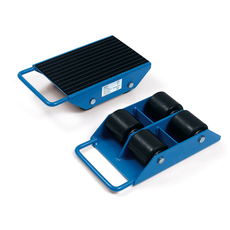 Construction solide en acier avec poignée en tube d’acier, revêtement époxy bleu RAL 5007. Platine recouverte de caoutchouc antidérapant. Pour un transport aisé et sûr d’objets lourds tels que : bacs, caisses, machines, etc?. Grands galets en nylon à roulement à billes.