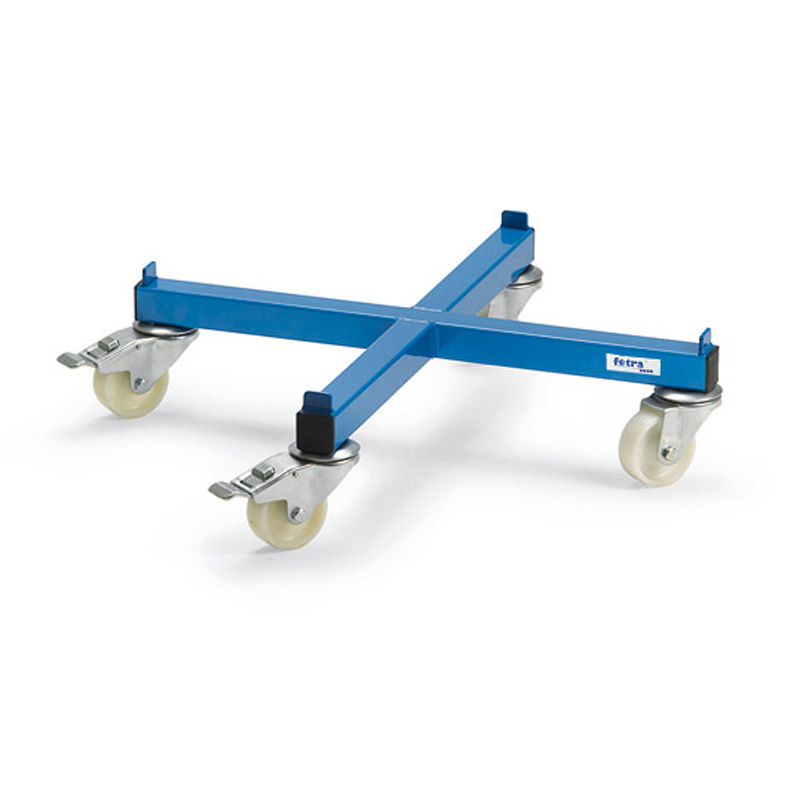 Armature en tube d’acier carré soudé avec butées antichute, revêtement époxy bleu RAL 5007. Rouleur pour le transport et le stockage vertical de fût contenance 200 litres. 4 roues pivotantes en polyamide dont 2 avec freins, roulement à palier lisse.