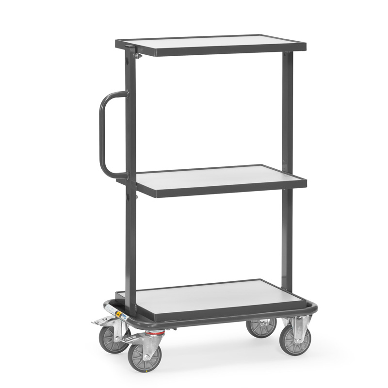 Construction conductrice d’électricité (ESD = Electrostatic discharge). Construction en tube et profilé d’acier. Revêtement époxy conducteur d’électricité gris ardoise RAL 7015. Plateaux conducteurs d’électricité selon norme DIN 68765, gris clair, rebord de 7 mm. 2 roues fixes et 2 pivotantes, freins sur roues pivotantes. Roues à bandage TPE-ESD (Elastomère thermoplastique) conductrices d’électricité, moyeu à roulement à billes. Conformément à la Norme 1757-3 (Sécurité des chariots de manutention). Charge plateau du haut et médian 50 kg.