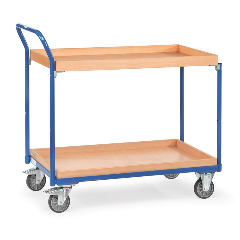 Ensemble mécano-soudé, revêtement époxy bleu RAL 5007 avec 2 caissettes en mélaminé surface effet hêtre, rebord de 45 mm, barre de poussée verticale. Charge maximum étagère haute : 80 kg. 2 roues pivotantes et 2 roues fixes à bandage TPE, moyeu à roulement à billes central. Freins sur roues pivotantes, conformément à la Norme EN 1757-3.