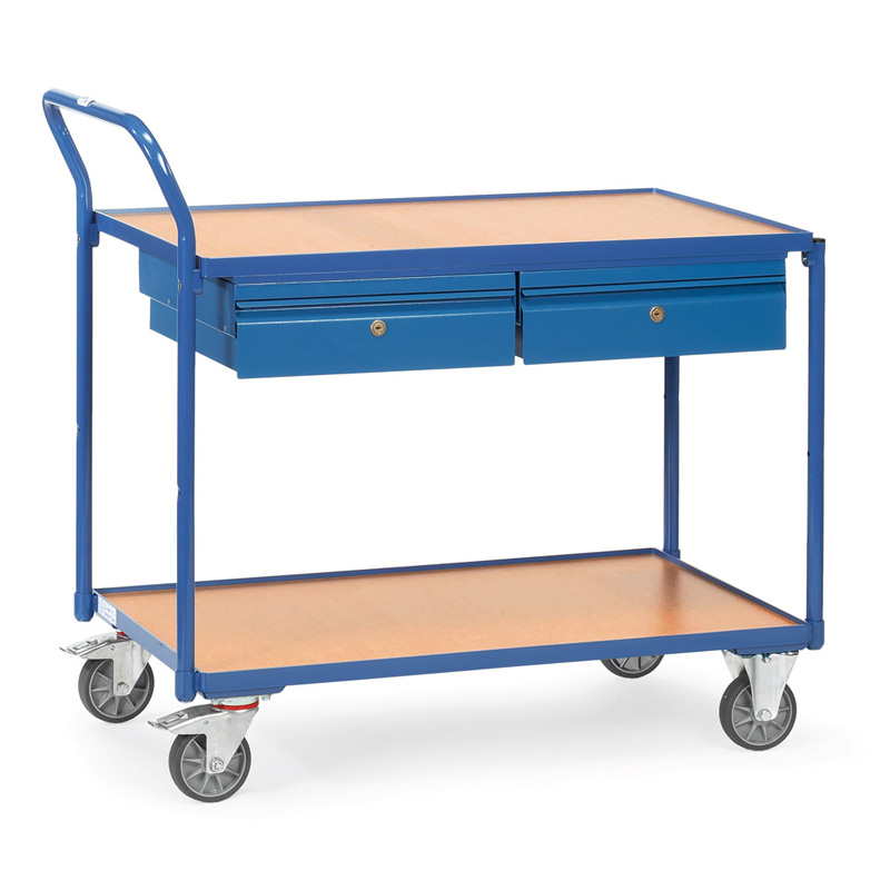 Ensemble mécano-soudé, revêtement époxy bleu RAL 5007 avec un plateau en mélaminé surface effet hêtre, barre de poussée verticale, rebord de 12 mm. Charge maximum étagère haute : 80 kg. 2 tiroirs en tôle d’acier (H X L X P : 105 x 415 x 490 mm), charge maximum tiroir : 25 kg. 2 roues pivotantes et 2 roues fixes à bandage TPE, moyeu à roulement à billes central. Freins sur roues pivotantes, conformément à la Norme EN 1757-3.