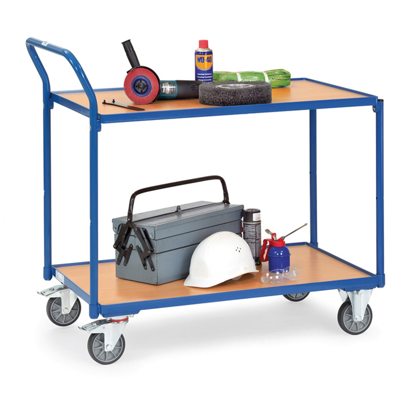 Ensemble mécano-soudé, revêtement époxy bleu RAL 5007 avec 2 plateaux en mélaminé surface effet hêtre, barre de poussée verticale, rebord de 12 mm. Charge maximum étagère haute : 80 kg. 2 roues pivotantes et 2 roues fixes à bandage TPE, moyeu à roulement à billes central. Freins sur roues pivotantes, conformément à la N orme EN 1757-3.