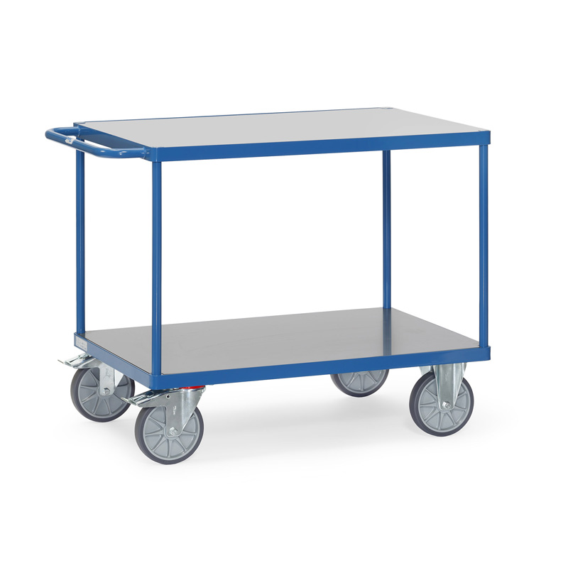 Système modulable. Ensemble mécano-soudé, revêtement époxy bleu RAL 5007, plateau en mélaminé surface effet hêtre. 2 roues pivotantes et 2 roues fixes à bandage TPE, moyeu à roulement à billes central. Freins sur roues pivotantes conformément à la Norme 1757-3 (Sécurité des chariots de manutention).