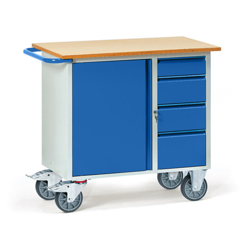 Construction en tôle d’acier, revêtement époxy, caisson gris RAL 7035, armatures et ouvertures RAL 5007. 1 placard avec 1 étagère fixe et 2 amovibles. 4 tiroirs (H x L x P : 1x 105 x 280 x 470 mm, 2x 160 x 280 x 470 mm et 1x 210 x 280 x 470 mm) avec glissière et serrure centrale à cylindre. Plan de travail en mélaminé renforcé épaisseur 19 mm. 2 roues pivotantes et 2 roues fixes à bandage TPE, moyeu à roulement à billes central. Freins sur roues pivotantes conformément à la Norme 1757-3. Livré démonté, montage facile.