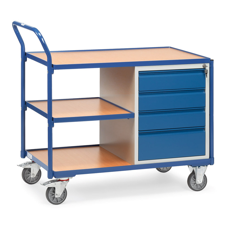 Ensemble mécano-soudé, revêtement époxy, caisson gris RAL 7035, armatures et ouvertures RAL 5007. Plateaux en bois avec rebord de 12 mm de haut. 1 placard roulant avec serrure centrale (H X L X P : 600 x 500 x 600 mm) et 4 tiroirs (3 x 120 mm de haut et 1 x 180 mm de haut). Ouverture au 4/5. Charge par tiroir : 25 kg. 2 roues pivotantes et 2 roues fixes à bandage TPE, moyeu à roulement à billes central. Freins sur roues pivotantes conformément à la Norme EN 1757-3.