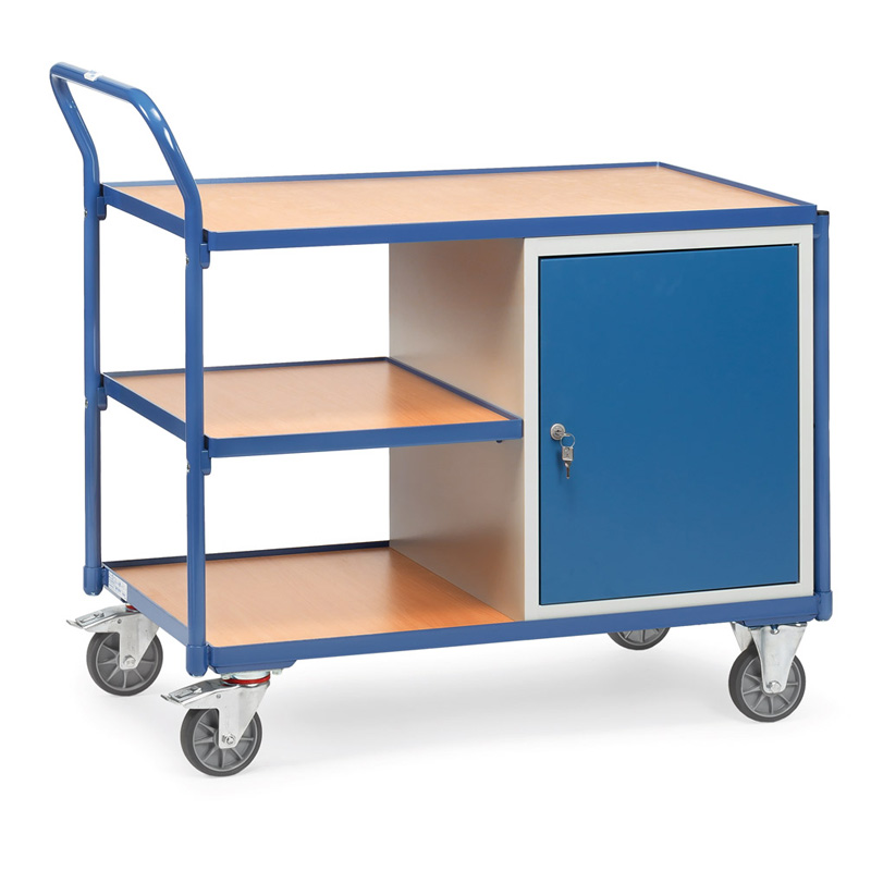 Ensemble mécano-soudé, revêtement époxy, caisson gris RAL 7035, armatures et ouvertures RAL 5007. Plateaux en bois avec 1 placard en tôle d’acier verrouillable (H X L X P : 600 x 500 x 600 mm) avec 1 étagère fixe et 2 amovibles. Charge par étagère placard : 30 kg. 2 roues pivotantes et 2 roues fixes à bandage TPE, moyeu à roulement à billes central. Freins sur roues pivotantes conformément à la Norme EN 1757-3.