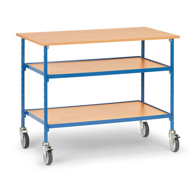 Ensemble mécano-soudé et boulonné, revêtement époxy bleu RAL 5007. Plan de travail en mélaminé renforcé épaisseur 19 mm, surface effet hêtre, 2 plateaux amovibles réglables au pas de 50 mm, compatible pour 1 hauteur de classeur. 4 roues pivotantes à bandage TPE, roulement à palier lisse. 2 roues avec freins. Charge maximum par plateau : 50 kg.